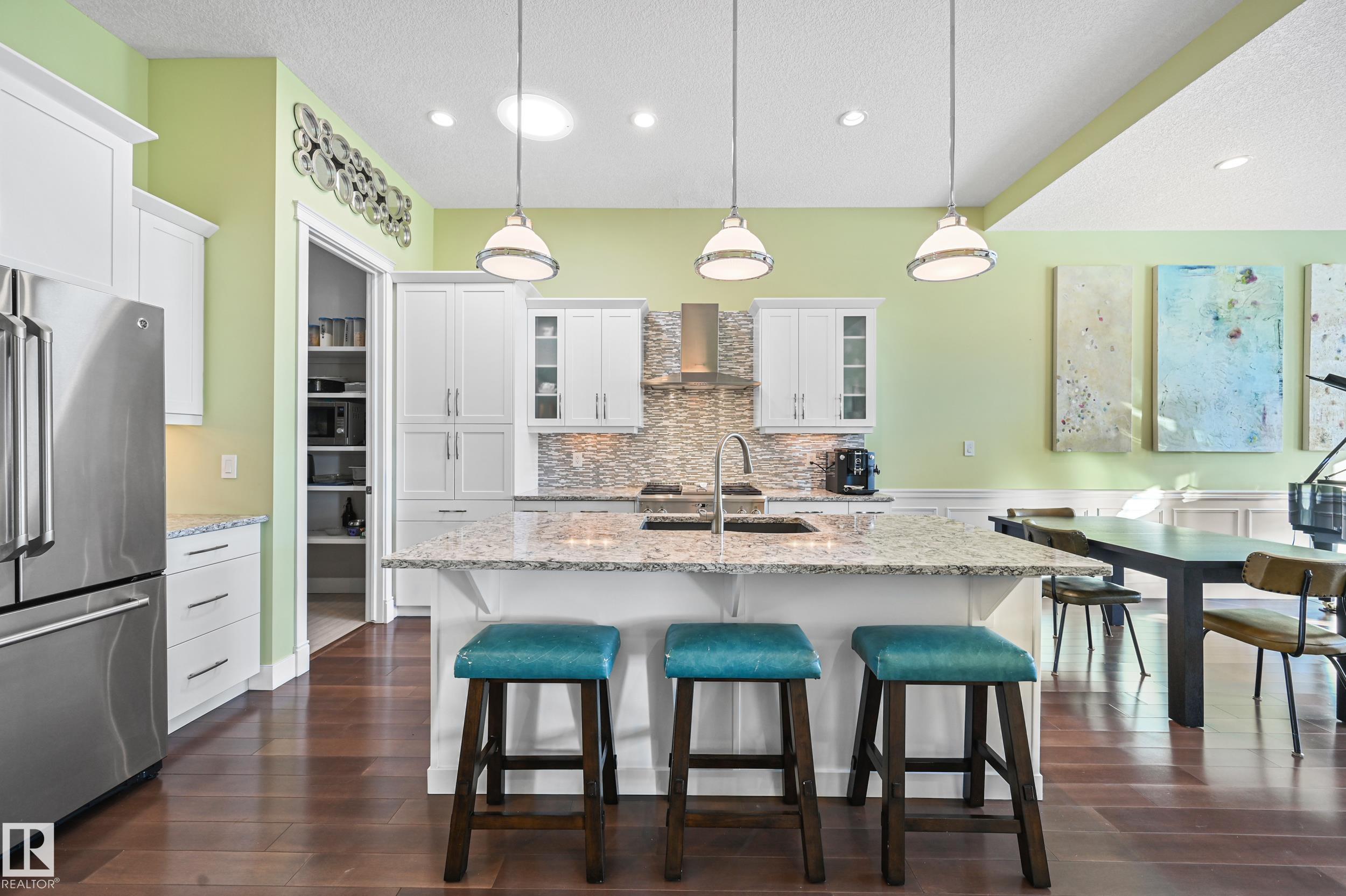 Highly sought after Cascades of Larch Park, backing ravine & fronting walking trails, ponds & park. Fully finished bungalow, offering approx 3300sf of living space w/3 living areas, 3 bedrooms +2 flex rooms. Gleaming hardwood greets you through an open floorplan & rays of natural light. This executive home features 9' ceilings, wainscoting, built-in speakers, upgraded mechanicals & in mint condition. Sunny west facing den is perfect for a home office/library. Great room highlights a stone surround fireplace...