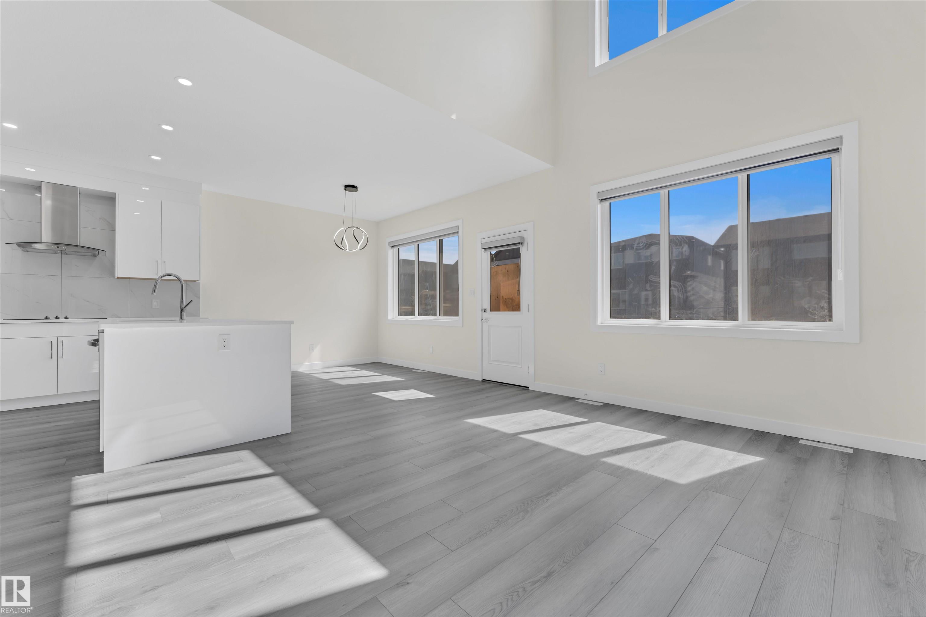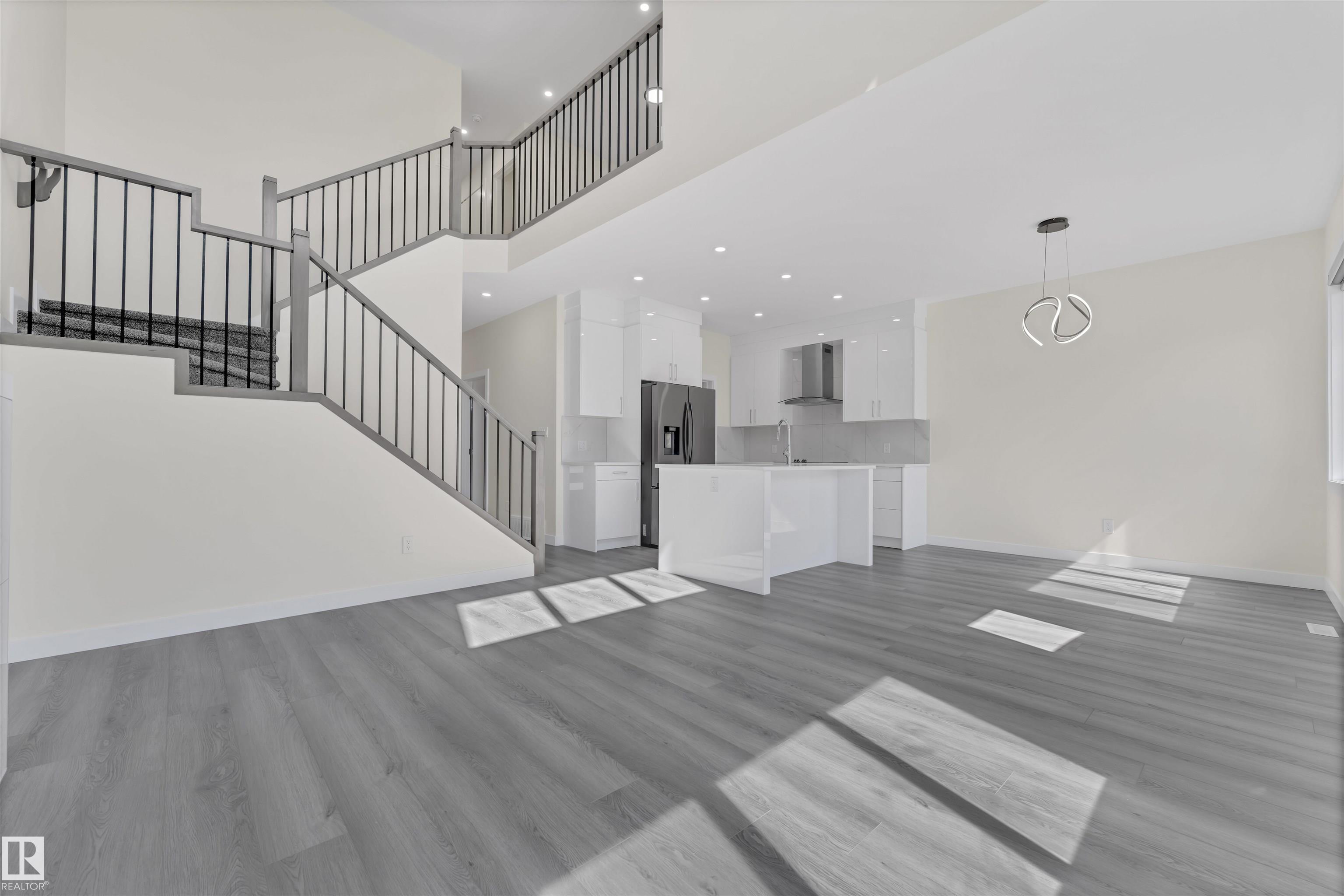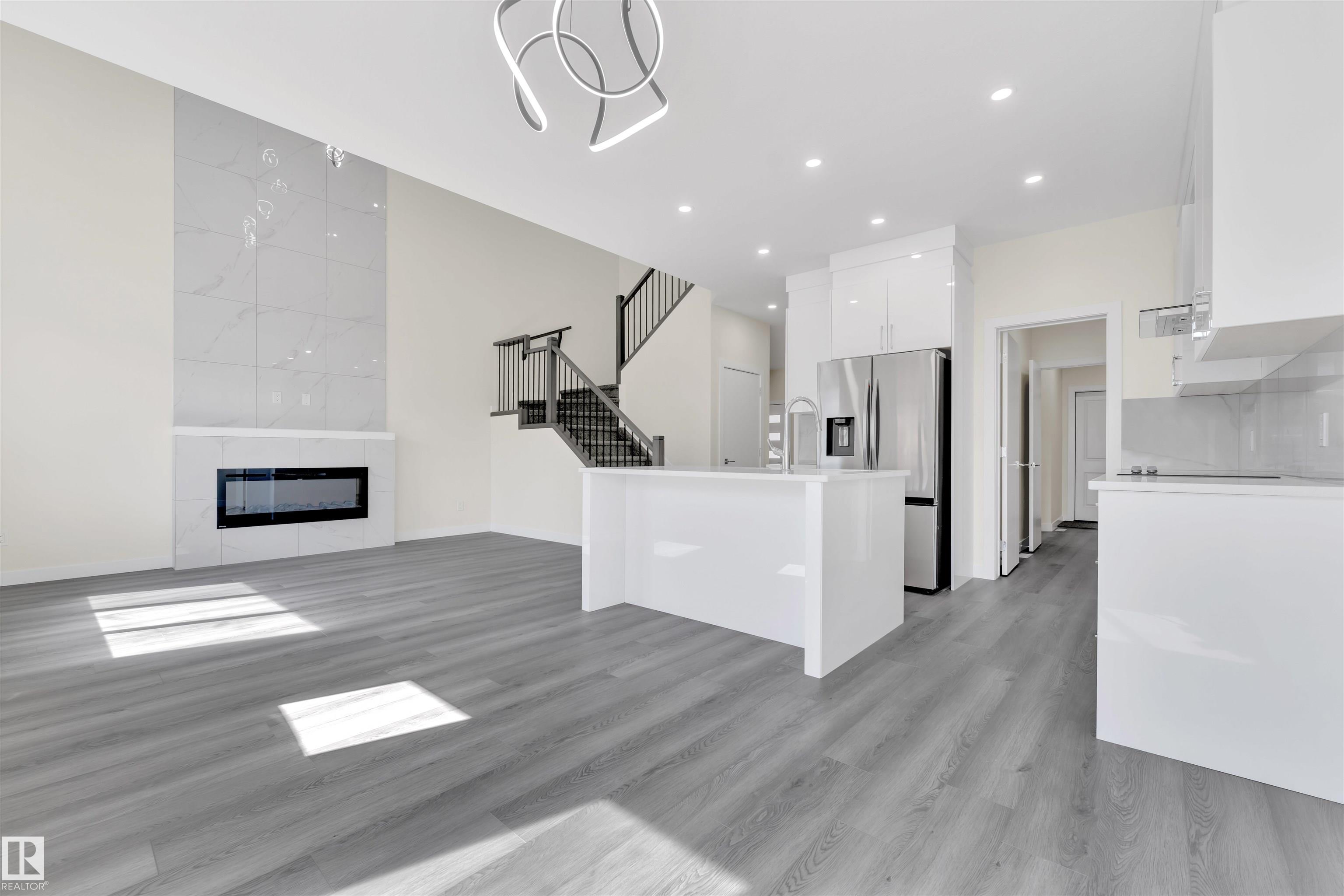Detached front double car garage home on a regular lot in Fenwyck, backing onto a walking trail. This open-concept layout features a main floor bedroom with closet and full bath, a modern kitchen with quartz countertops and center island, plus a separate spice kitchen. The living room boasts open-to-below ceilings, an electric fireplace, and tile feature wall. Dining nook opens to the backyard. Vinyl flooring throughout main and upper floors, with elegant spindle railings. Upstairs includes a bonus room, la...