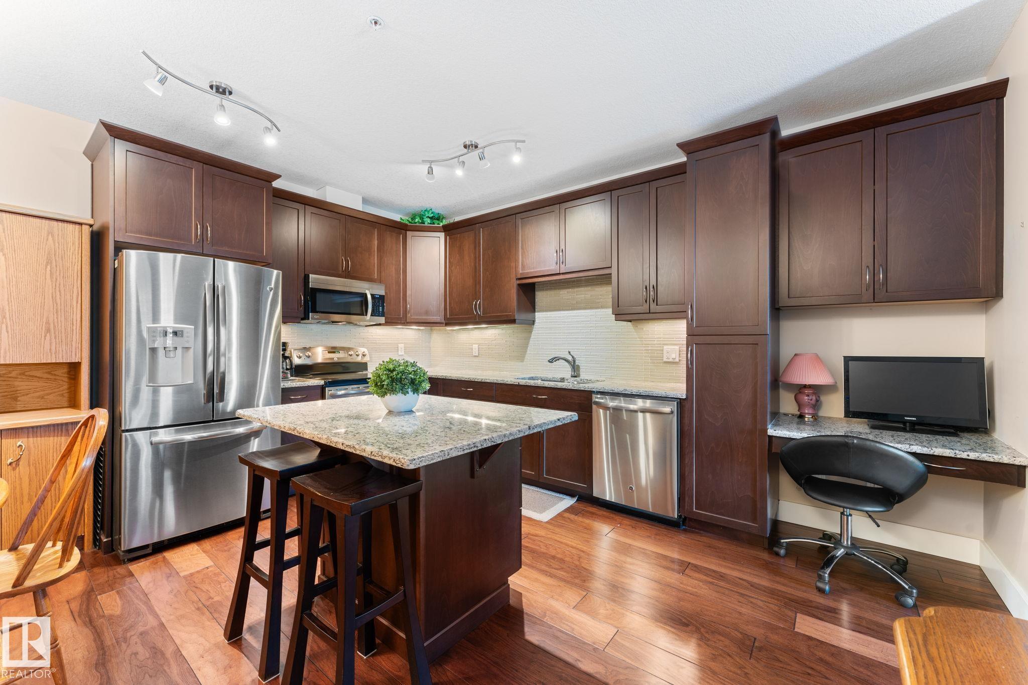 Immaculate 2 bedroom 2 bath unit with 2 underground parking stalls and storage unit. Terrific complex next to pond/park in popular MacTaggart community close to bus and shopping. Spacious kitchen features loads of cabinets, island, pantry, stainless steel appliances and granite counters. Great room is open to the kitchen and dining area. Spacious primary bedroom with full ensuite bath. Additional features include central air conditioning, hardwood floors and balcony. Building amenities include exercise room...