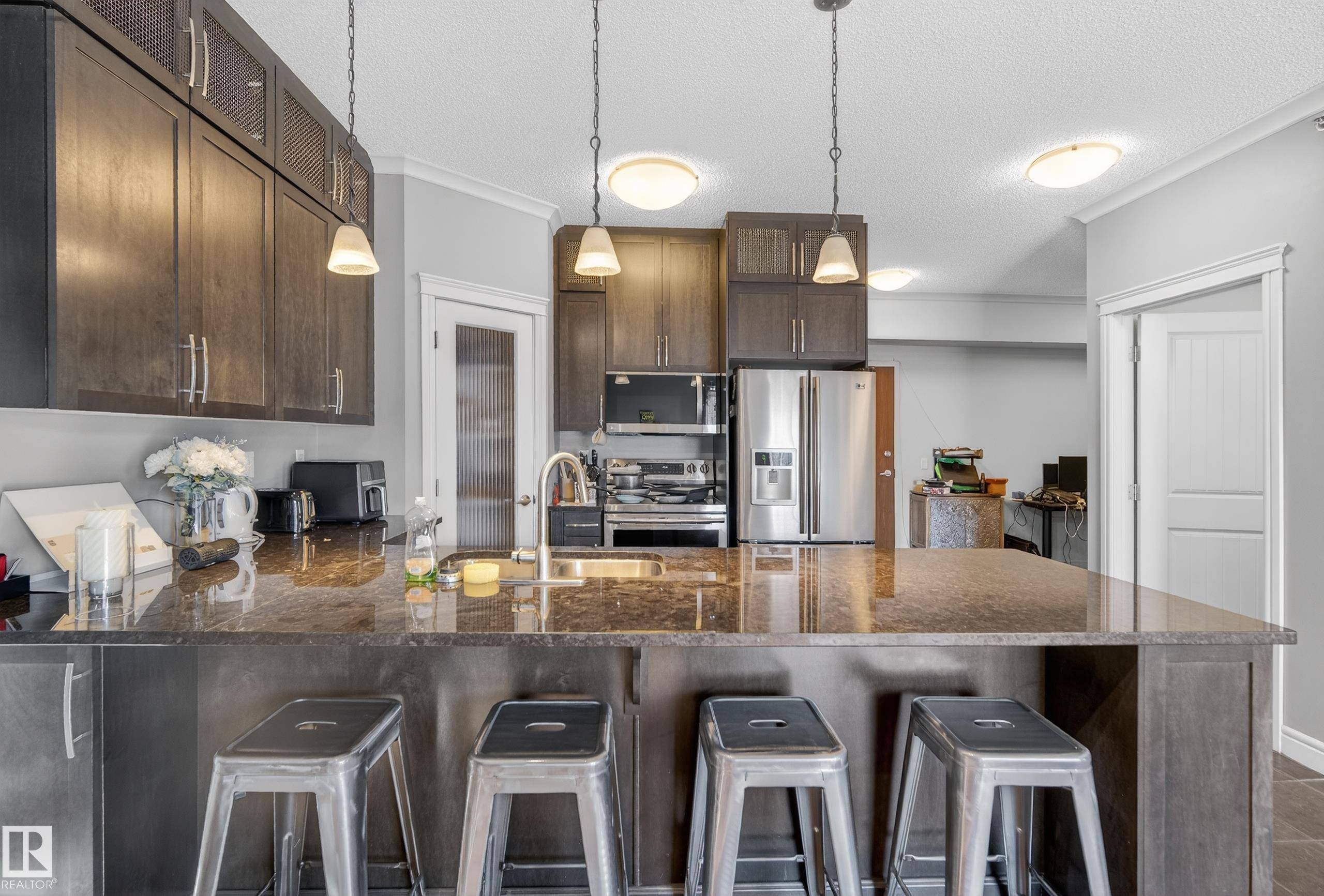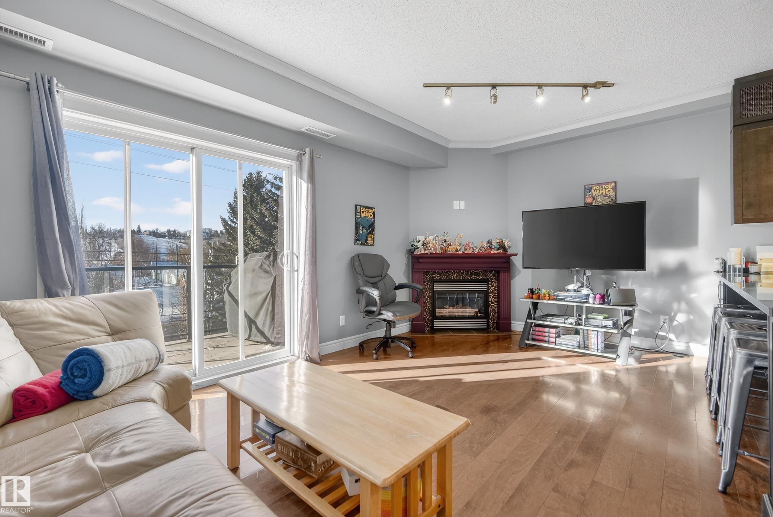 Welcome to The Soho in Cloverdale, where urban convenience meets river valley living. This beautifully appointed 3rd-floor 1 bed + den condo offers the perfect blend of comfort, style & location. Featuring 9 ft ceilings and rich hardwood floors, the open-concept great room is anchored by a cozy corner gas fireplace and filled with natural light from your south-facing balcony—perfect for relaxing or entertaining. The kitchen showcases granite countertops, ample cabinetry & a functional layout ideal for every...